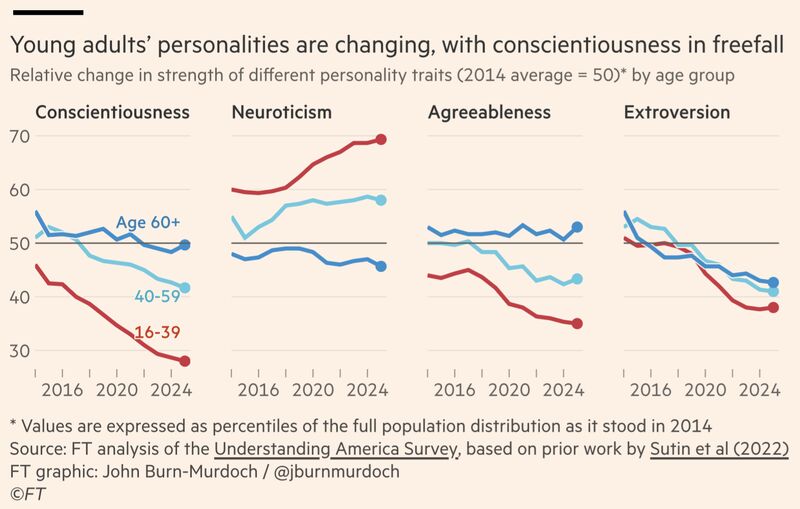 Detta var väldigt intressant och kan verkligen förklara min initiala fråga. En minskning i samvetsgrannhet påverkar ju förmågan att ta ansvar, vara organiserad och upprätthålla långsiktiga åtaganden. Och på bilden du skickade så har denna graf fullständigt kraschat.
