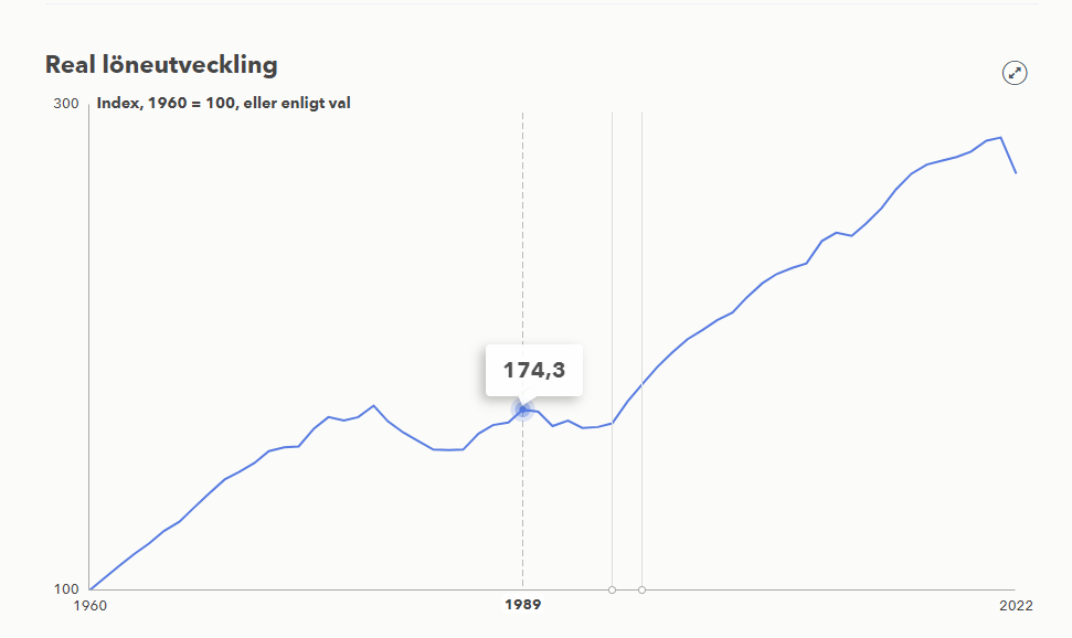Förstora kurvan så får du se. Reallönerna sjönk mellan 1989 och 1995.