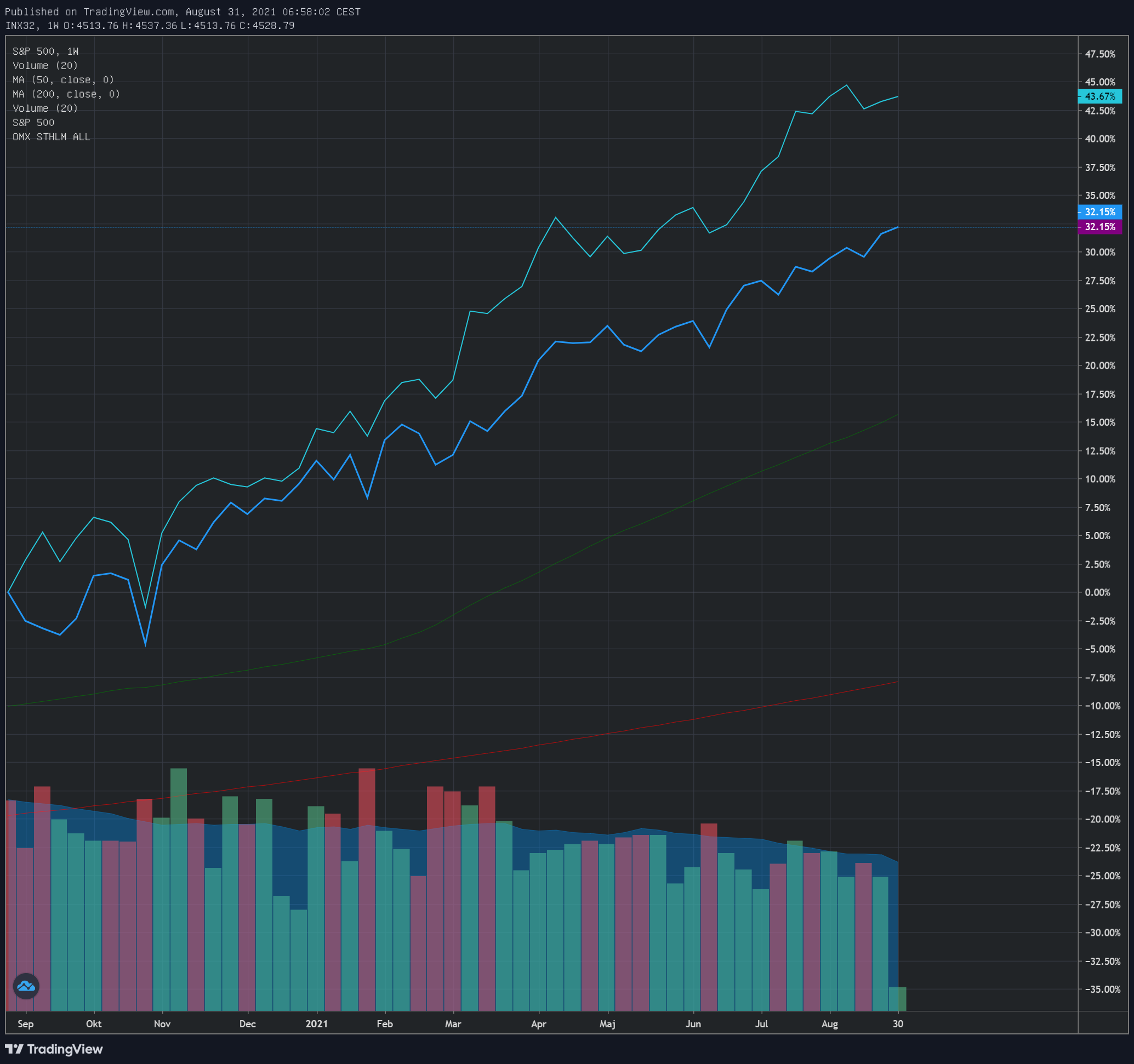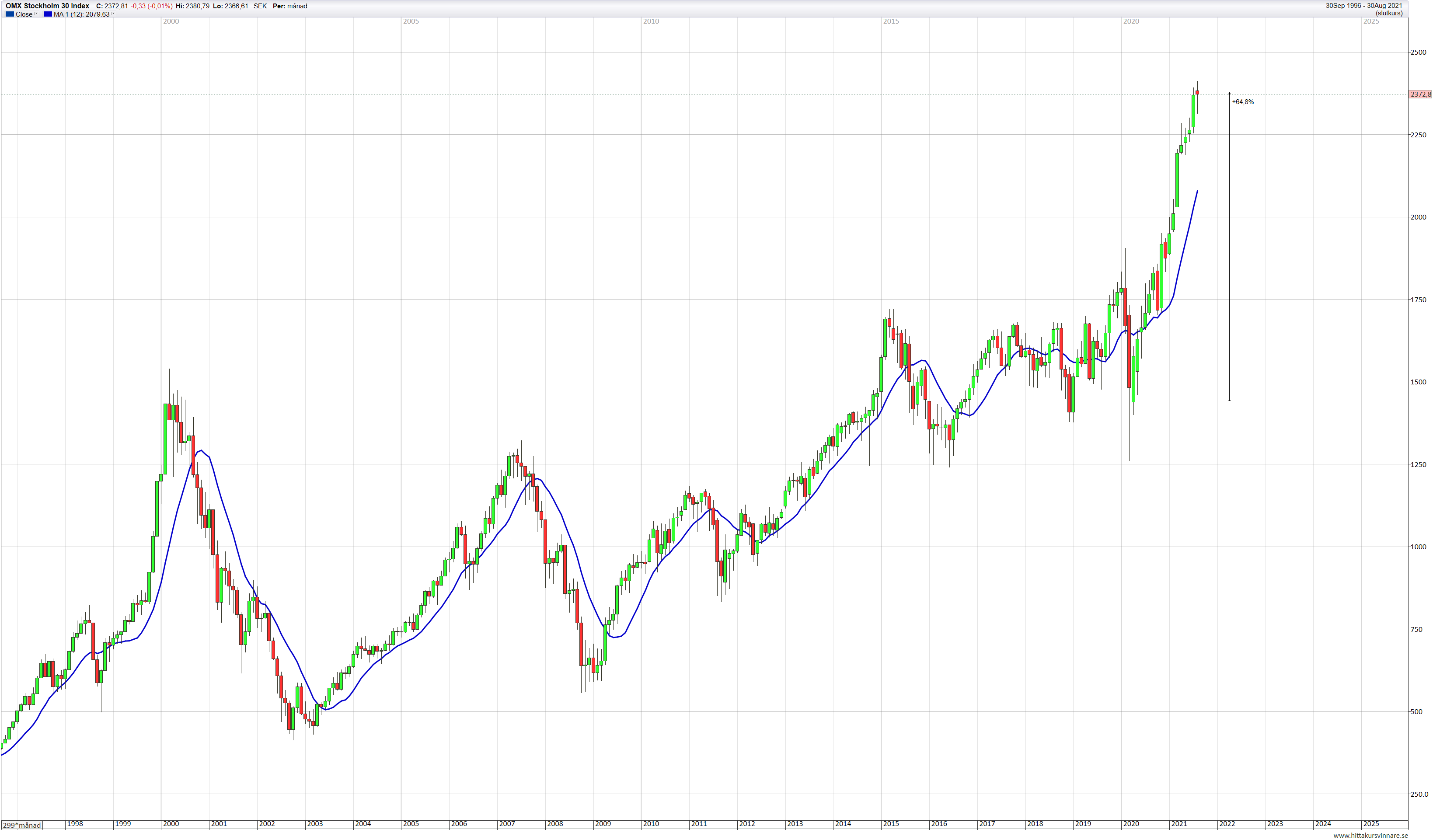 Apropå en tidigare diskussion i forumet idag så kikade jag vidare på OMXS30 och ingen av oss har nog missat att det har varit en galen rusning sen Corona-botten förra året. Den tvära stegringen och skillnaden mot dess årsgenomsnitt börjar närma sig milleniets IT-krasch. Jag tror inte på något sätt att vi är i närheten av samma nedgång, men en avsvalkande rekyl skulle vara på sin plats.