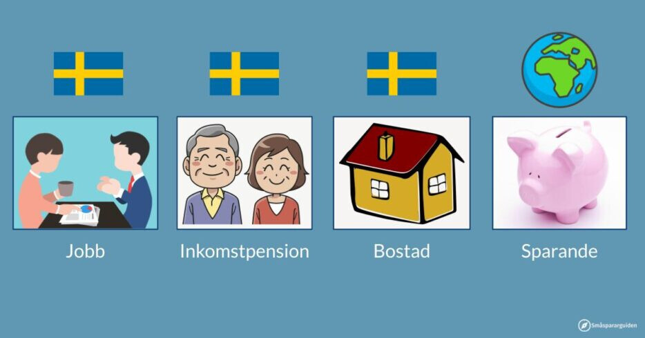 Det här betyder att om Sveriges ekonomi utvecklas bättre än resten av världens kommer det antagligen att gå ganska bra för dig ändå. Att du då får lite sämre avkastning på dina sparpengar och de valbara delarna av din pension är tråkigt, men antagligen något du kan leva med.