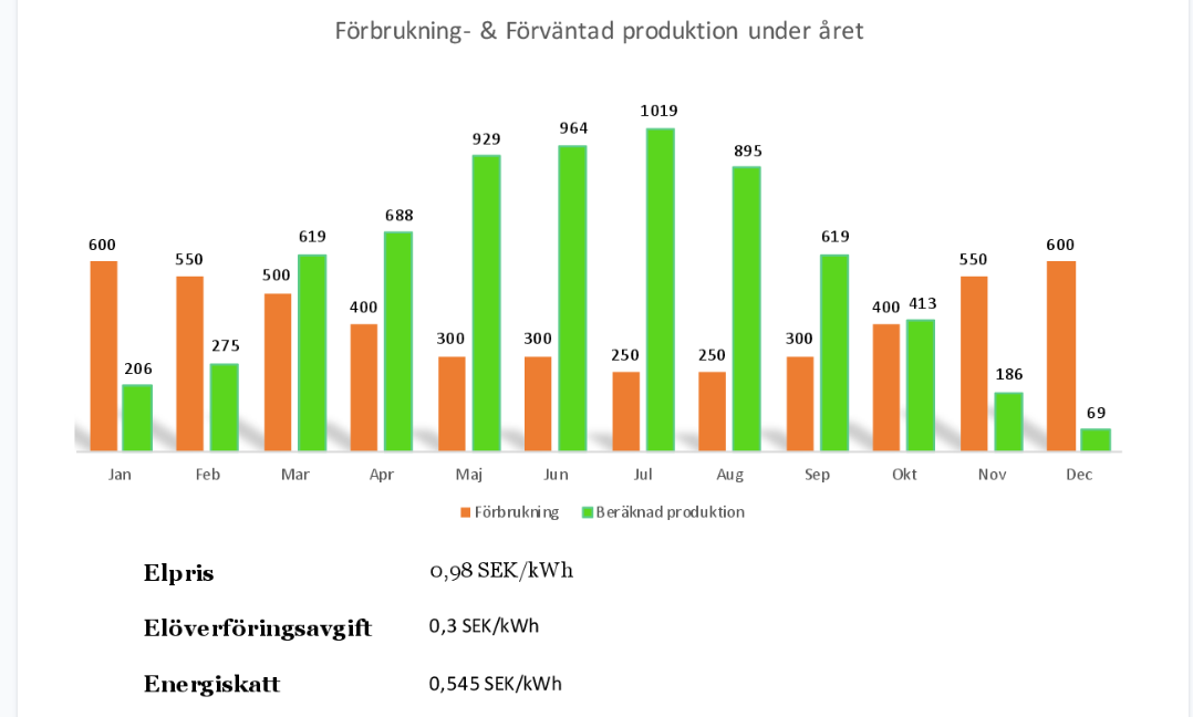 Vi förbrukar 400-450 kWh under sommar månaderna å då köper vi runt 150 kWh å använder 300 kWh av de produserade… Under vinter halvåret så förbrukar vi inte mycke mer el än under sommaren för värmesystemet är vedeldat vattensystem…