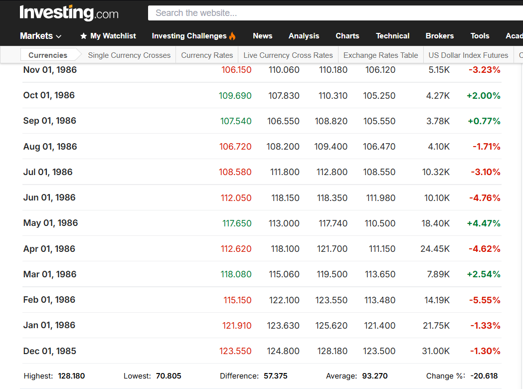 Det är intressant att se att medan DXY sjönk från ca. 120-130 ned till nivåer kring 80 efter Plaza Accord 1985, så sjönk Broad Index endast från ca. 60 till 55 under motsvarande period. Även att se att Broad Index i princip har ökat konstant under de senaste 50 åren, medan så inte varit fallet med DXY (eller Narrow Index).