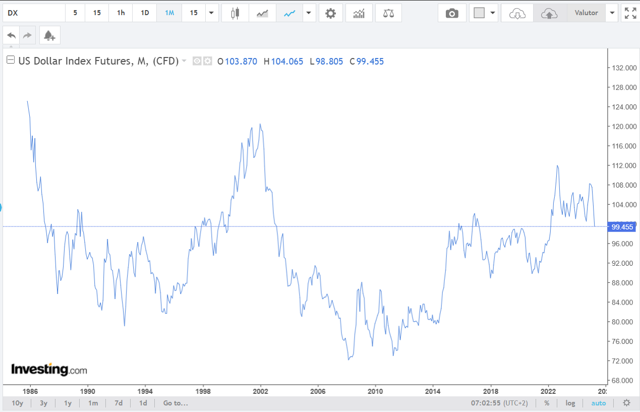 Som jag skrivit ovan så verkar Trump ambivalent och motsägelsfull. Vad är en “lagom” nivå enligt honom? US Dollar Index har historiskt legat på nivåer mellan ca 70 och 125. Är dagens nivå kring 99-100 den som administrationen eftersträvar, eller vill de gå ännu lägre? Svårt att säga, då inga konkreta målnivåer uttrycks.