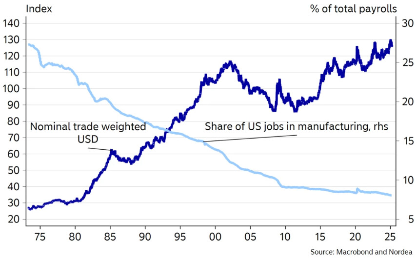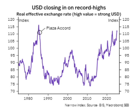 Det var då jag läste en rapport från Nordea om Mar-a-Lago Accord, som det gick upp för mig. Broad Index är, som jag förstått det, samma sak som Nominal Trade Weighted USD i bilden nedan (ur Nordeas rapport).