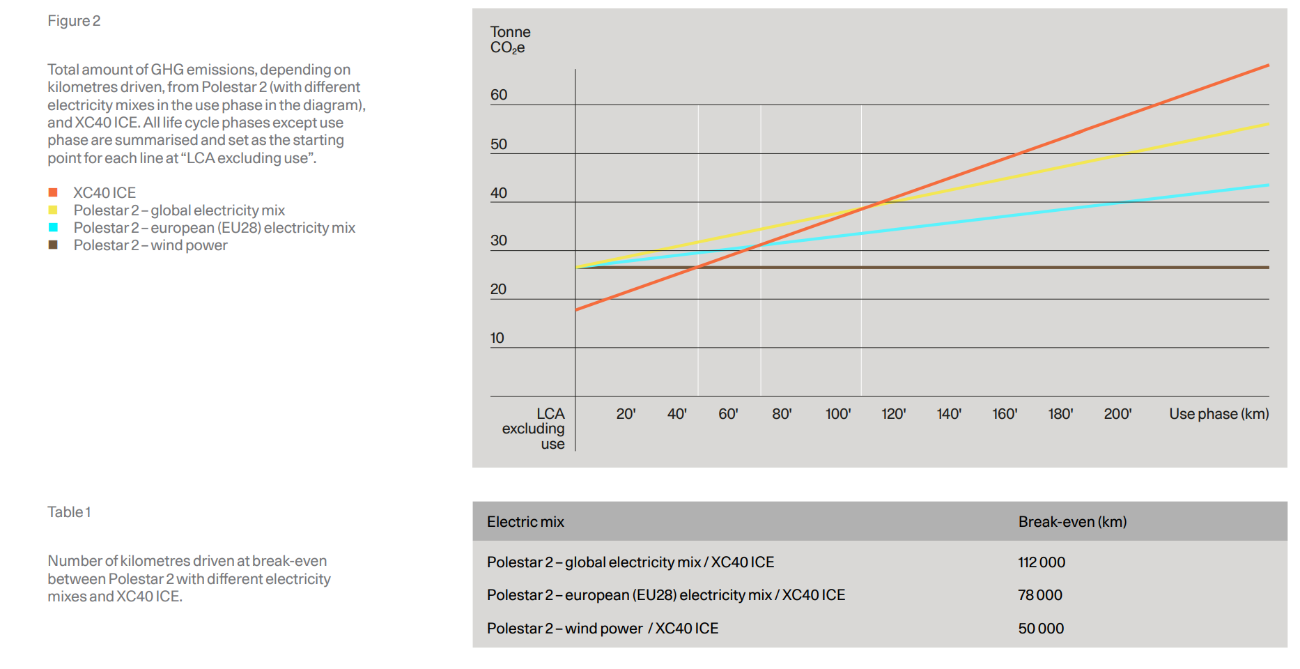 som visar att även om du kör på en global elmix (som innehåller mängder av kolkraft från Kina) så är Polestar 2 bättre än en sprillans ny Volvo XC40 med förbränningsmotor efter att bilen har kört 11 000 mil. Om du istället tankar med svensk elmix är vi någonstans mellan europeisk elmix och ren vindkraft, säg ~7 000 mil innan elbilen har tjänat in sin klimatpåverkan vid produktion.