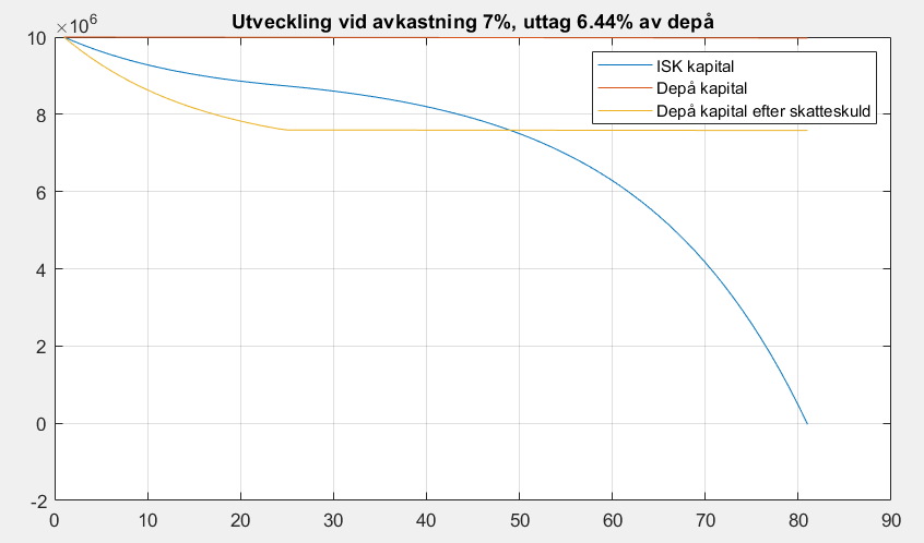 Nu är Jonny mer aggresiv men siktar på att behålla kapitalet och tar ut 6.44% (vilket med schablonskatten betyder att kapitalet hålls konstant ty (1+0.07-0.0012)(1-0.0644)=1. Initialt sjunker verkligt kapital efter betald skatteskuld, men när schablonbeskattningsläget inträffar så stabiliserar sig depåns värde. Jennys ISK håller sig länge ovanför, men även här förlorar hon asymptotiskt.
