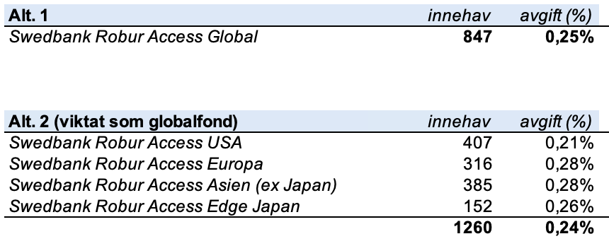 Men om man vill ha bredd i portföljen till låg avgift så är även alternativ 2 ganska dåligt. 1260 innehav för 0,24% är långt ifrån marknadsledande även om det hade varit en enda fond. Så att få det i en portfölj med 4 fonder är inte så lysande.