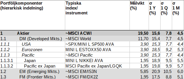 @Frihet Min höstack är väldigt lik din. Den är dock lite större eftersom jag har lite drygt 10% Emerging Markets. Och precis som du säger så finns det inget behov av ombalansering om man vill fortsätta ha en marknadsviktad portfölj. Men om man köper eller säljer stora andelar så får man förstås se till att fördela affärerna proportionerligt mellan fonderna.