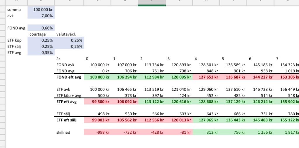 Med dina siffror tror jag break even går vid knappt 3 år. Håller man längre än så då blir ETFen billigare.
