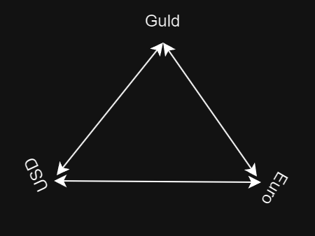 Kolla upp “arbitrage”, så förstår du varför priset på USD, Euro och guld är en enhet där alla rör sig tillsammans för att hela tiden vara i synk. Du kan inte gå från USD->Guld->Euro->USD och tjäna pengar på detta, för då skulle folk bara köpa så i all oändlighet och tjäna oändligt med pengar på detta.