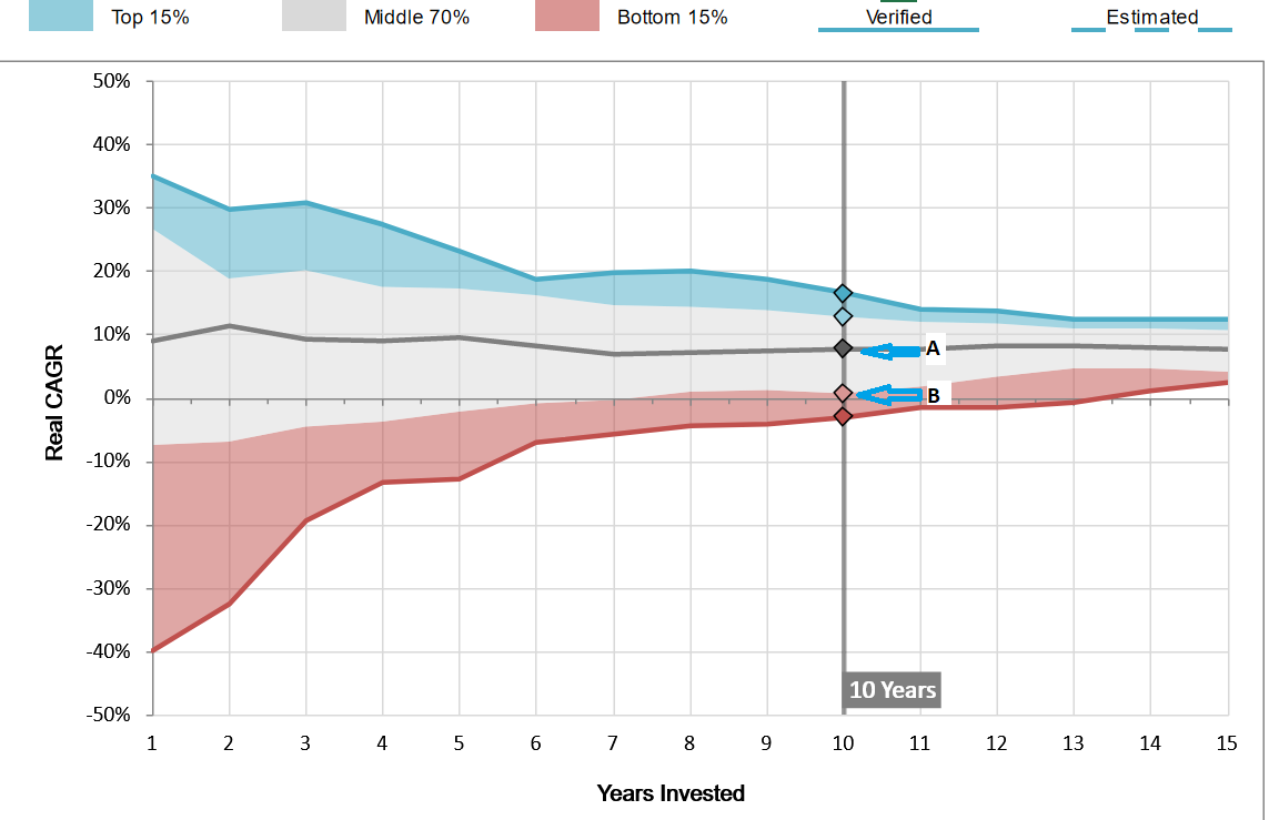 Skriver man in Länförsäkringar global indexnära i SEK exempelvis med 55 USA och 45 WLD XUS så har en investerare på 15:e percentilen, dvs gränsen mellan 14 och 16, på en tio års period, en avkastning på 0,7%, dvs som sparkonto? edit: det här är inflationsjusterat osv, CAGR.