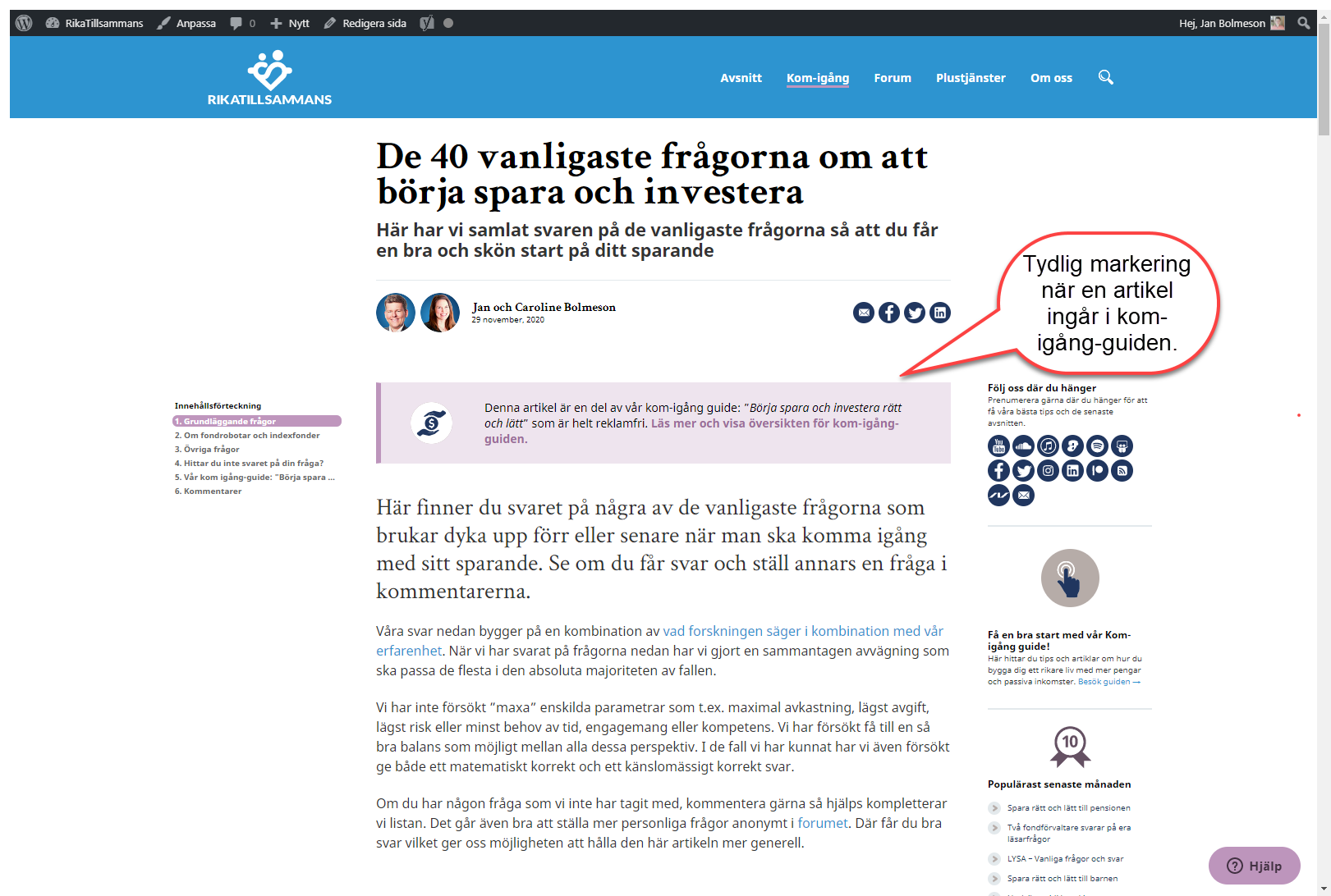 Därför försöker vi vara supertransparenta. Kom igång-guiden innehåller ingen reklam. Inga sponsrade länkar, inga banners, ingen reklam. Ingenting. Vi vill inte heller förvalta dina pengar, sälja dig någon produkt eller tjänst. Det vi tjänar pengar finns under plustjänster och på att vissa av bloggens artiklar är samarbeten eller innehåller sponsrade länkar. Dessa är alltid tydligt uppmärkta. Läs gärna annonspolicy.