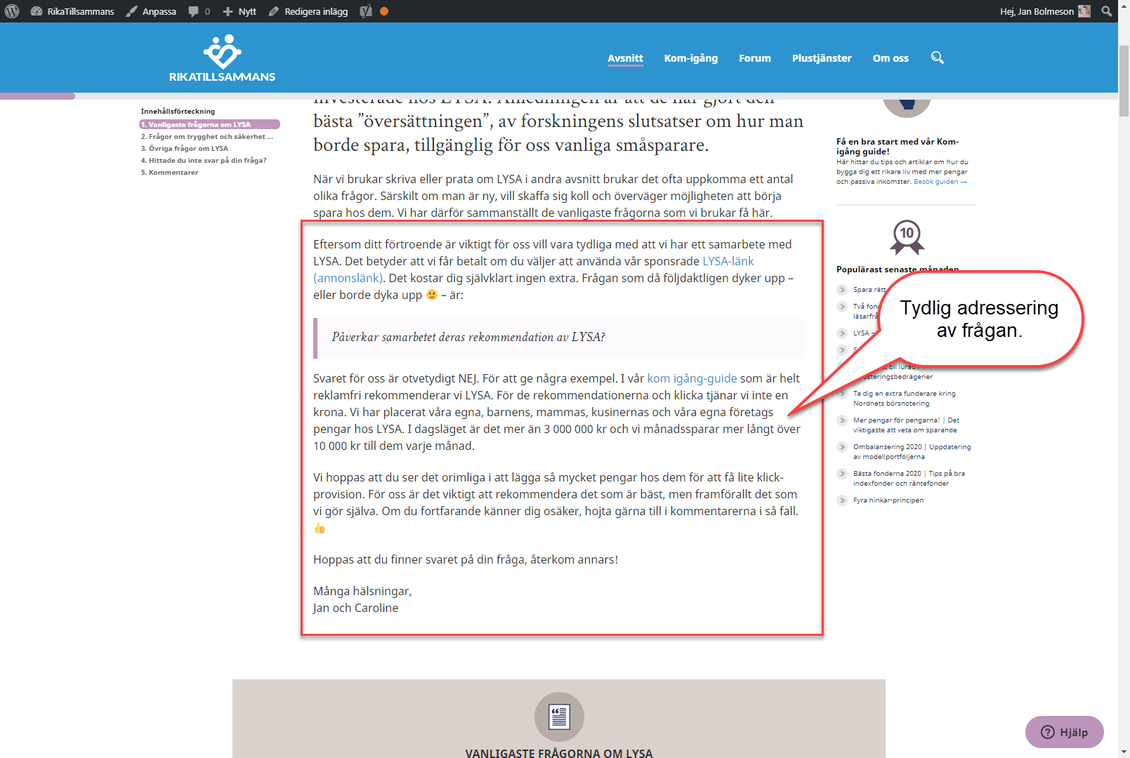 Du undrar om Jan har sagt eller påstått något som inte är sant eller som är direkt vilseledande? Jag vet inte vad du menar med ”direkt” vilseledande. Men som jag skrev känns det fel för mig att först läsa mycket om Lysa och hur bra det är, och senare inse att det föreligger ett samarbete med Lysa och att det kan gynna Jan ekonomiskt att skriva så. Det är lite som fråga 27 bland vanliga frågor