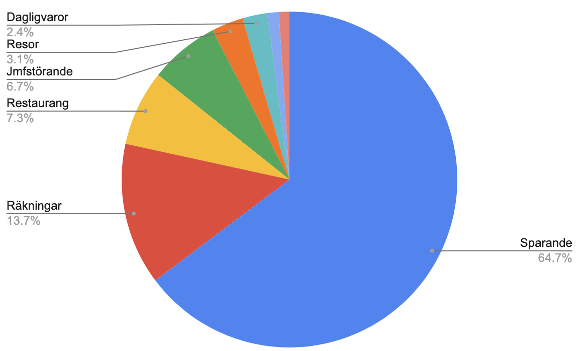 Sambon brukar betala för dagligvaror och jag för resor och restaurangmat och det mesta av hyran, så bilden här, med bara min del, blir lite skev (ingen gemensam ekonomi). Ändå bekräftar den min bild av att restaurangbudgetposten sprungit iväg lite och att vi kanske borde äta mer hemlagat. Å andra sidan är det också tydligt att vi har så att det räcker och blir över.