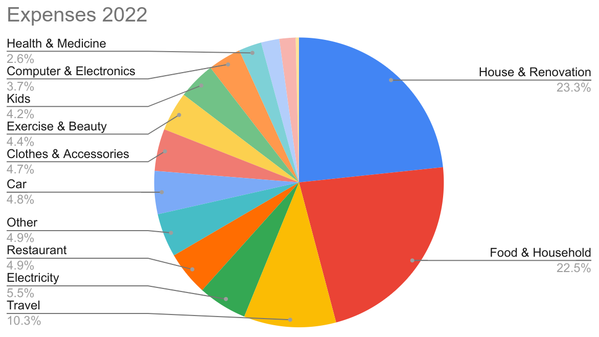 Jag räknar inte sparande som spenderande, nedanstående är en sammanställning av våra kostnader över 2022 (inte riktigt komplett eftersom sista kreditkortsräkningen kommer först 15e januari, men räknat med ett medel över 11.5 månader).