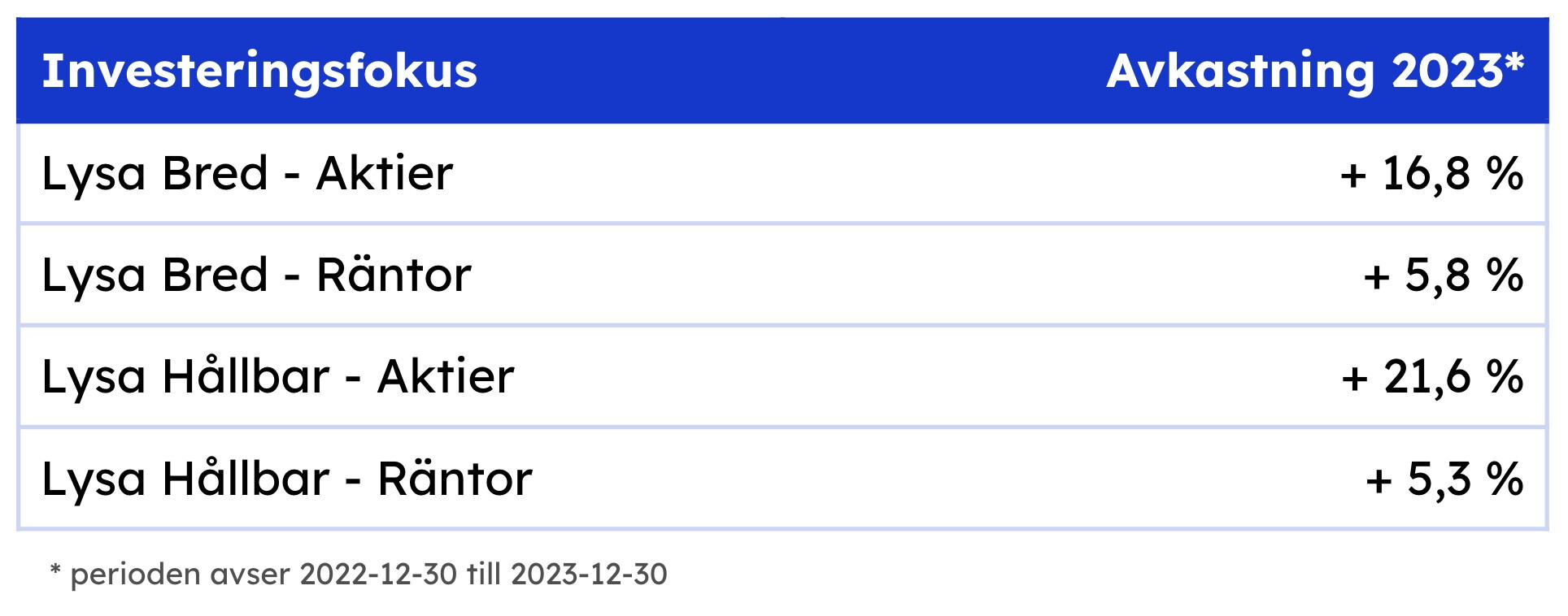 Tänker det kunde vara kul att se vad våra olika rekommenderade sparformer gav för avkastning 2023. Här kommer tre vanliga fonder som brukar rekommenderas. Fyll gärna på med fondrobotar m.m.
