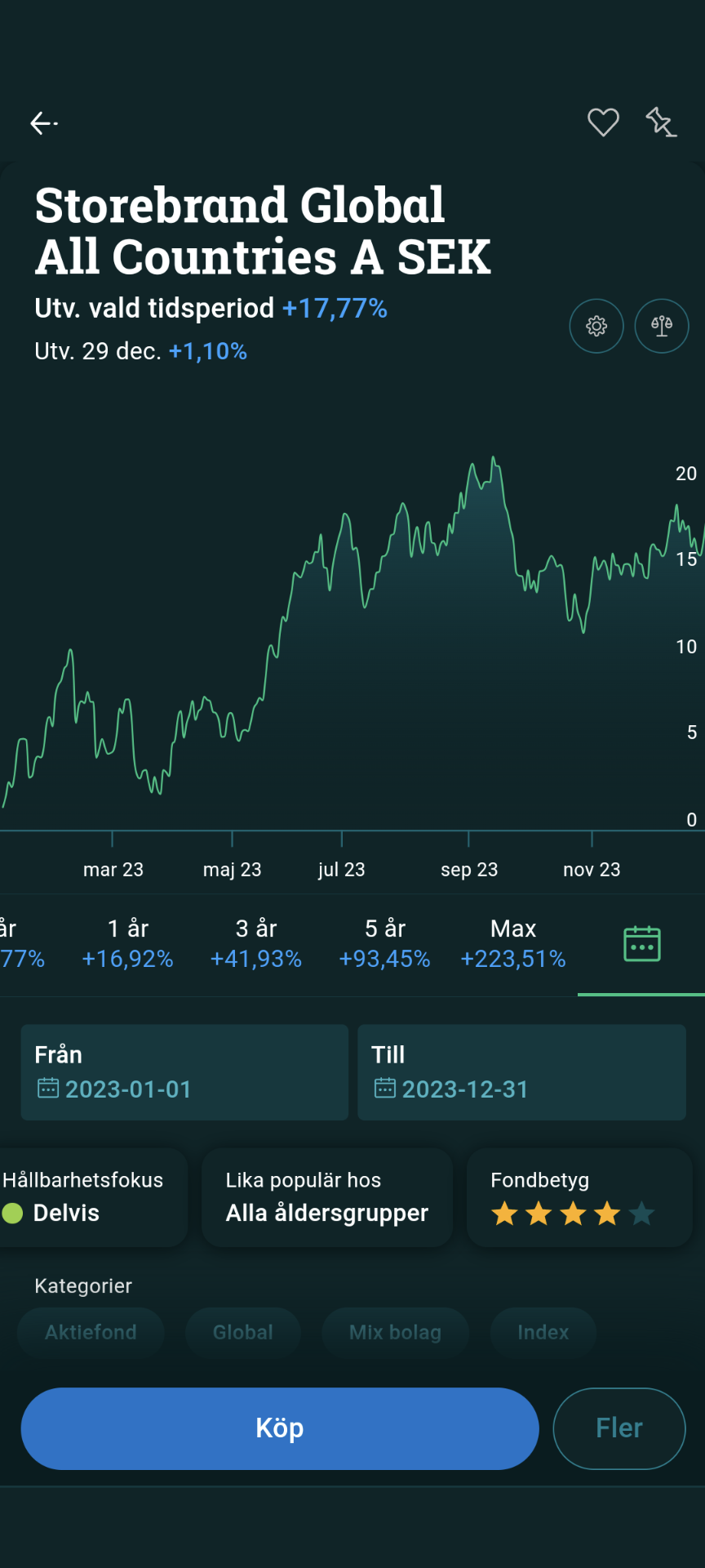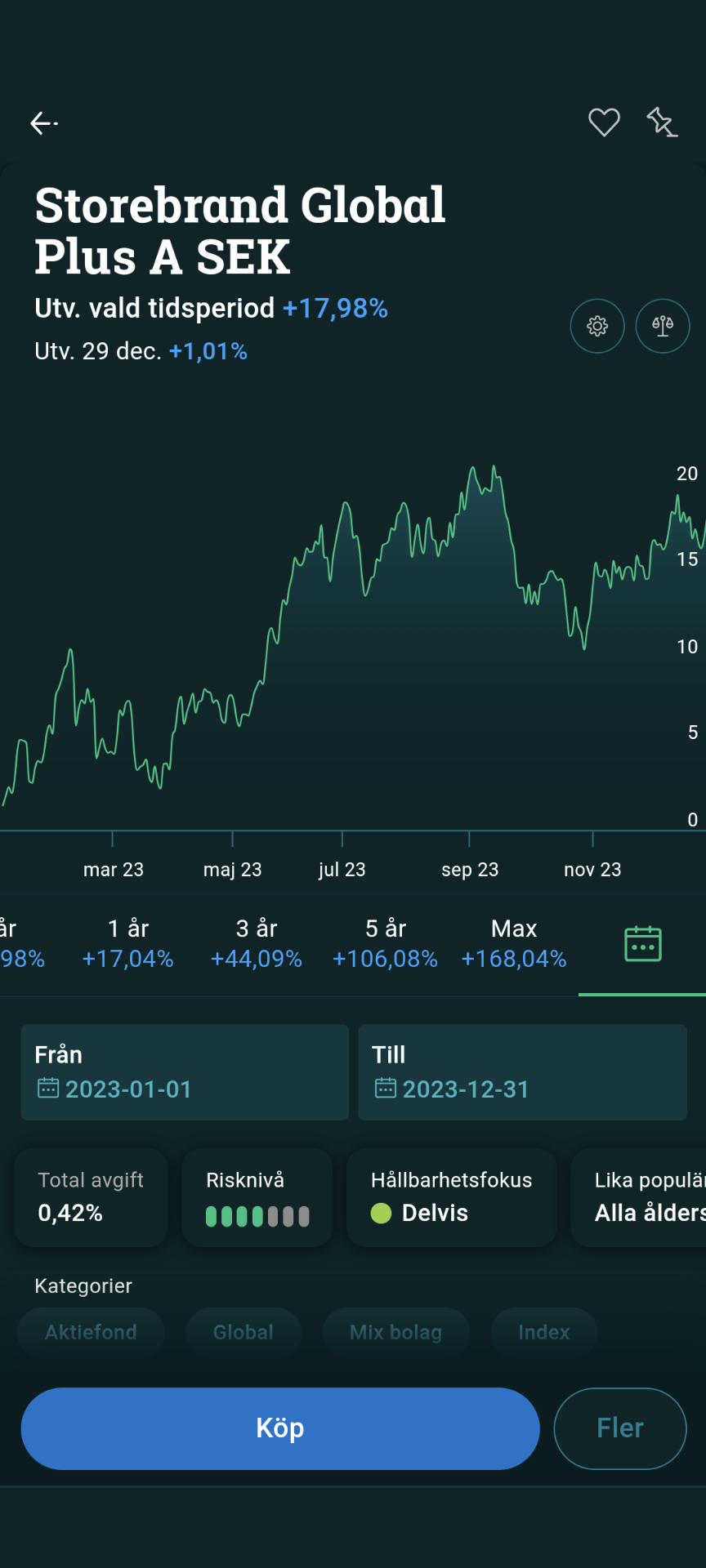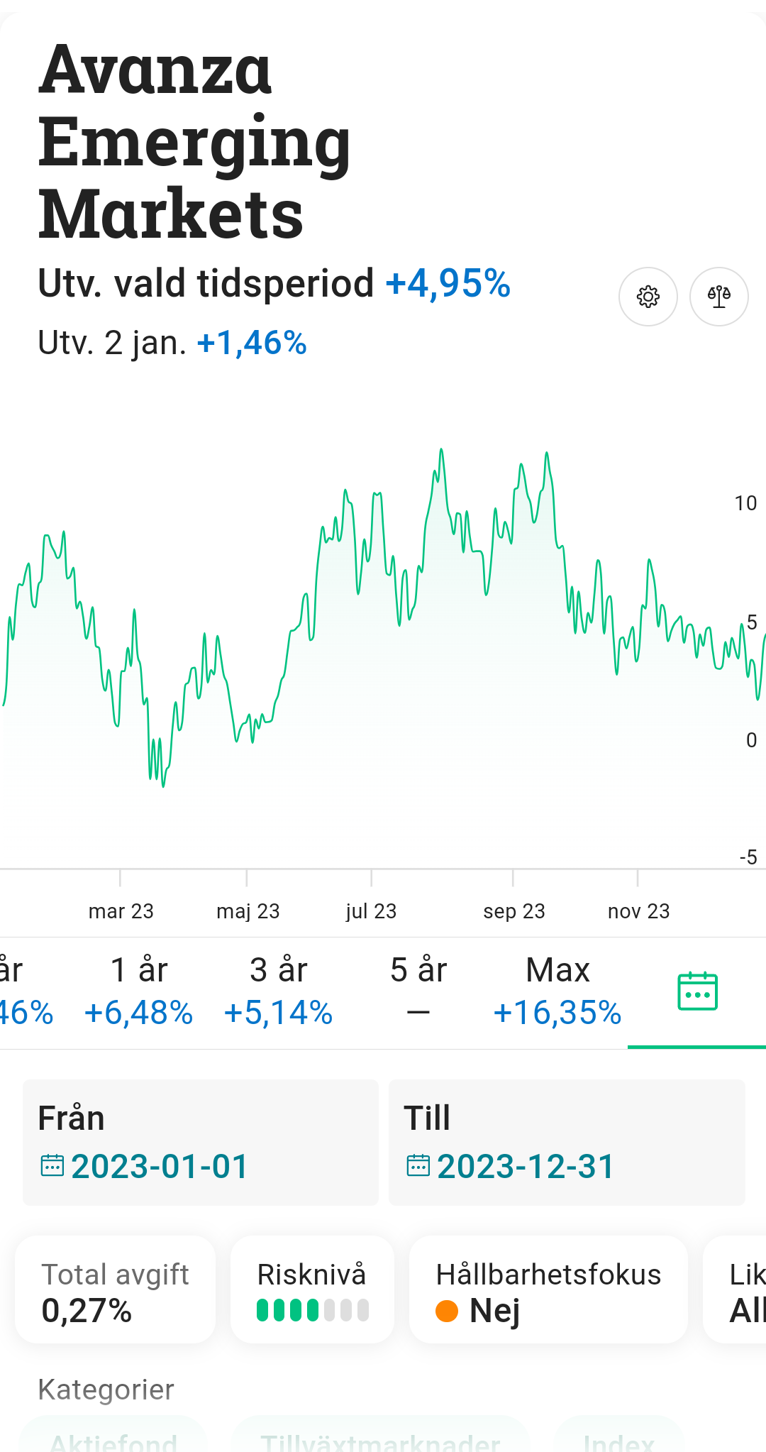 Angående skillnaden i avkastning tänker jag att Länsförsäkringar gått bäst då den inte innehåller tillväxtmarknader. Kina gick uselt 2023, vilket drar ner alla fonder som följer ACWI-indexet. Både AP7 och Storebrand innehåller tillväxtmarknader.