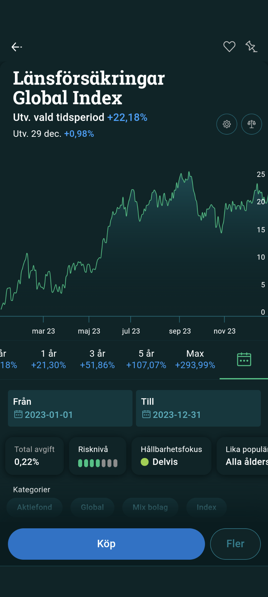 Min slutsats för 2023 är att en så ren exponering mot MSCI World-indexet med så låg avgift som möjligt gav bäst avkastning av alla tillgängliga sparformer som vi rekommenderar. Ännu bättre gick det för amerikanska indexfonder som följde S&P500-indexet. Över tid lär dock regioner prestera olika. Sverige och tillväxtmarknader kanske går bättre 2024, vem vet? Jag kör alla regioner.