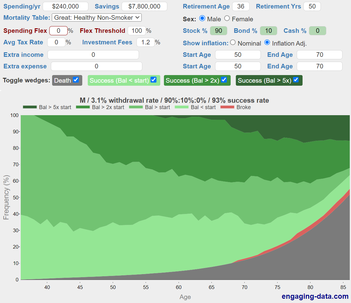 ca 7 % procents risk att pengarna tar slut från vid 85 års ålder om du tar ut dom i 50 år