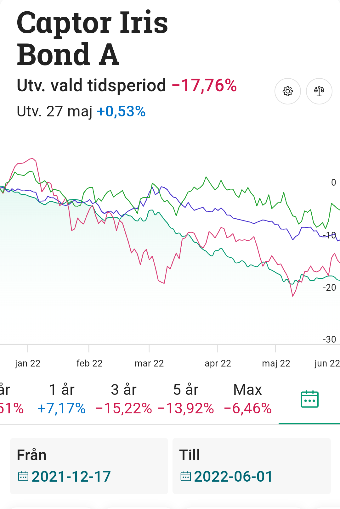 I månadsrapporten fr juli 2022 ser man att “Volatilitet - portfölj” för AMF Räntefond Mix låg på 2,2%. I motsvarande rapport fr april 2024 är det 4,7% (om jag tolkar det rätt, “Std Dev” i rapporten). För Captor Iris Bond läser jag 7.9% (Nyckeltal - 2024-05-24), och för Danske Invest Globala Realräntor står det 8,81 (3 år) och 7,78 (5 år).