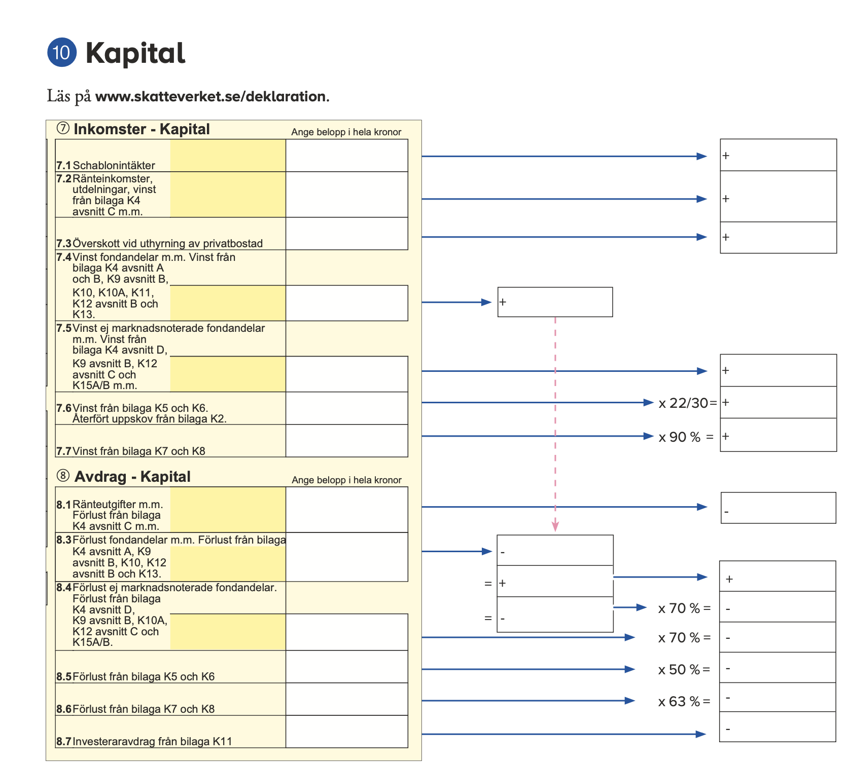 I deklarationsblanketten kan du se exakt hur det fungerar, i ruta 8.1 ränteutgifter upp. I ruta 8.3 + 8.4 förlust av fonder. Detta summeras med kapitalvinster. Blir resultatet negativt får du räkna 70% av detta vid avdrag mot andra inkomster.
