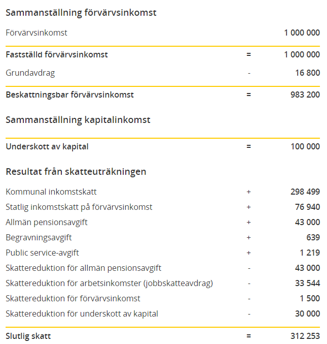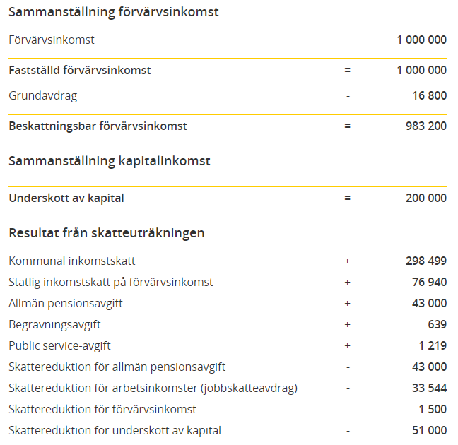 För att övertyga dig om att du missförstått skattelagsstiftningen kan vi göra en skatteberäkning på skatteverket där vi anger en inkomst av tjänst på 1000000 och en ränteutgift på 100000. Notera sista raden Skattereduktion för underskott av kapital.