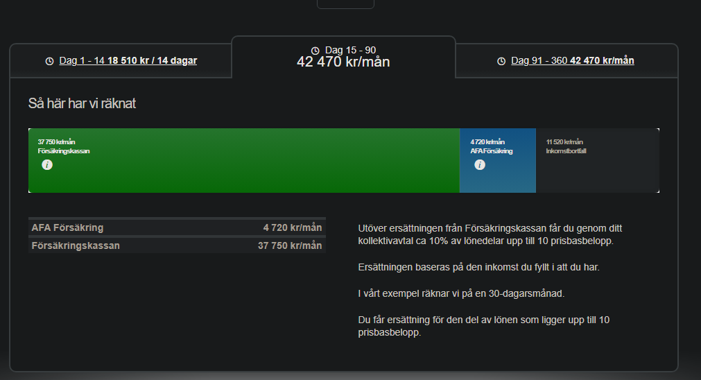 Stämmer bra med minnet. Tjänstepensionsbolaget ersätter först från dag 91 (och den försäkringen är betydligt dyrare men den ersättningen är högre), har man flera försäkringar så jämkas det så att man aldrig får ut mer än 90% (om man inte har specialförsäkring för företagare där man kan försäkra typ 108%, minns inte benämningen på den).