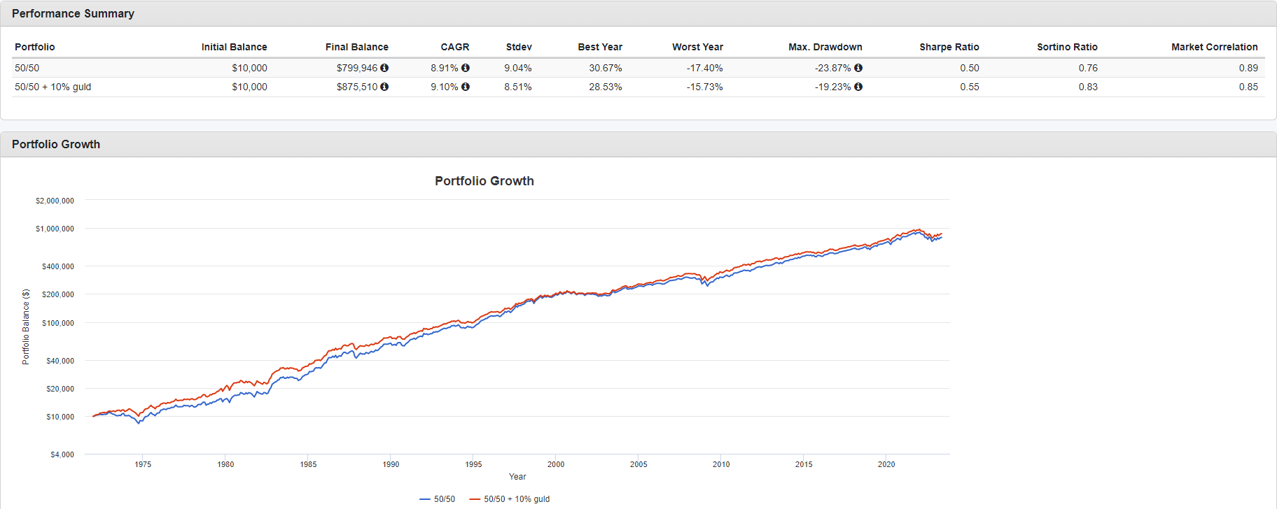 På PV kan man backtesta från 1972, och här jämför jag en 50/50 aktier/räntor med 50/50 + 10% guld, precis som i artikeln ovan. Årlig ombalansering precis som i artikeln. Vi ser att både riskjusterad och absolut avkastning är högre för portföljen med guld. Börjar jag istället 1975 får jag ungefär samma siffror som i artikeln, så siffrorna bör vara jämförbara.