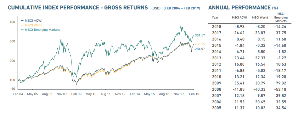 Tog bilden från Retire In Progress - ETF List 2019 Part 2: World, och de skriver “Investing in MSCI World or MSCI ACWI is almost exactly the same thing.I’m not saying investing in EM doesn’t make sense. I’m saying that if you “market cap” the world, Developed countries cover more than 90% of the markets. If you want to bet on EM, you should allocate more than their current weight in the ACWI index.”
