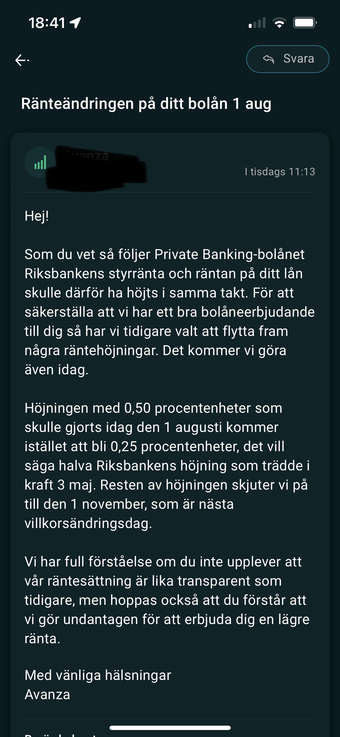 Det är det jag också stör mig på. Att de kommunicerar en ränta utåt på de publika sidorna medans man redan nu VET att de tänkt höja pga de RB-höjningar som redan varit. Jag skulle tro att de flesta som haft lite koll på/följt Avanzas boräntor tror att Avanzas NUVARANDE ränta korrelerar mot RB-räntan som den är IDAG.
