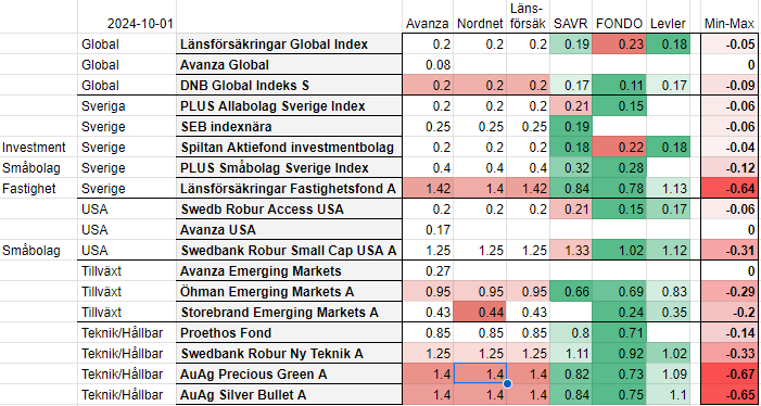 Jag ser över lite fonder och sammanställde en lista med några fonder som jag tittat på under årens lopp och jämförde deras avgifter på några olika plattformar: