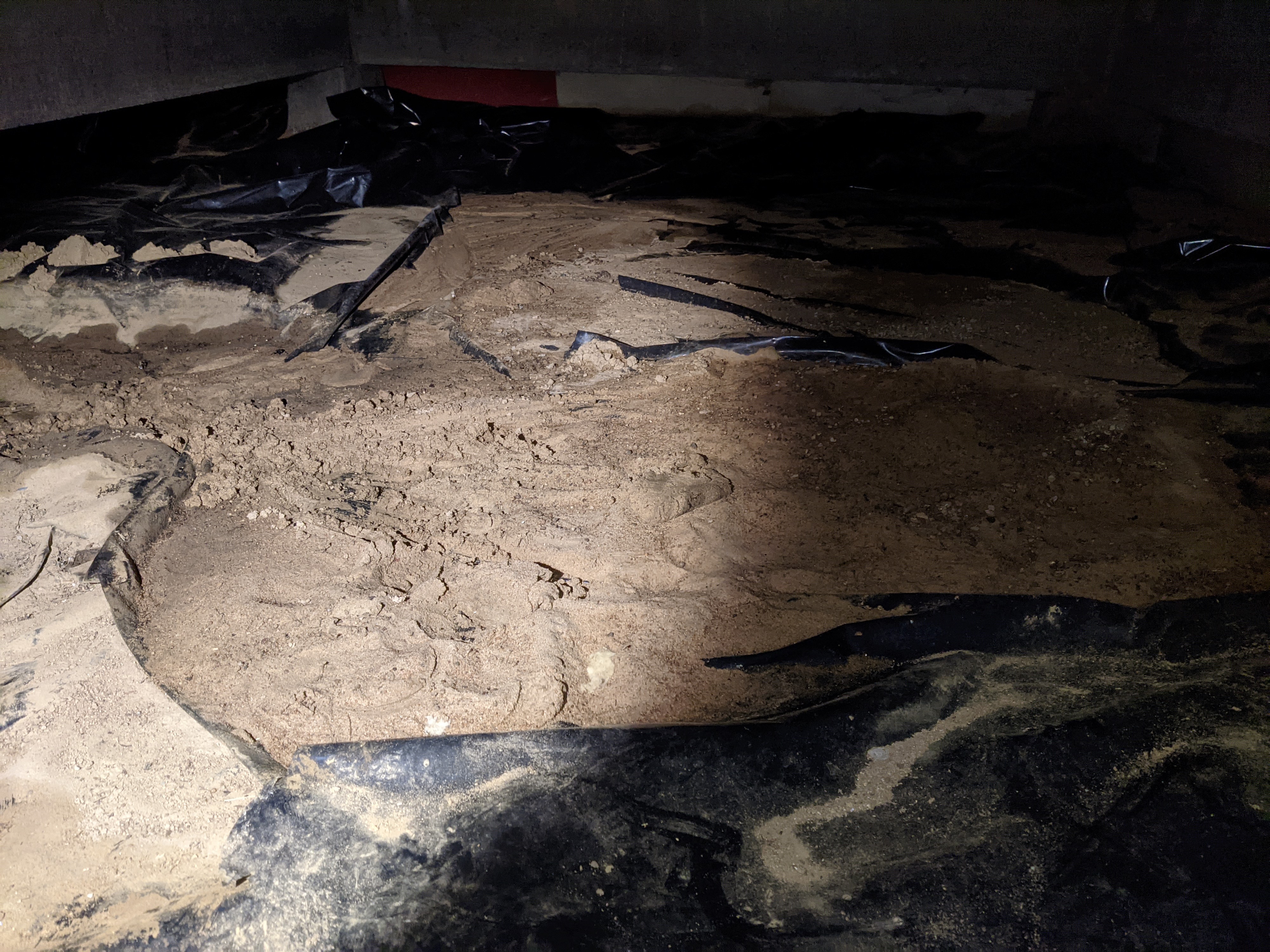 Om problemet kommer tillbaka skulle jag överväga att anlita fackman. Det är även här vi har sand på plasten, i hela övriga grund finns ingen sand. Kan ta en bättre bild ikväll, tänkte kolla lite noggrannare på hur plasten är utlagd också.