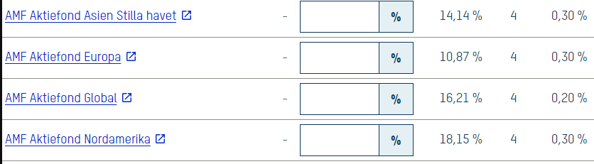 OK, tack att du kollat, då hade jag rätt, klent utbud. Hur gör jag om jag vill ha fler fonder att välja på, med tanke på avgiften osv. Vet inte heller om det är klokt att fonden viktar mot räntor ju äldre man blir…kanske bättre tänka på nåt annat sätt? (Jag är född 70-tal)