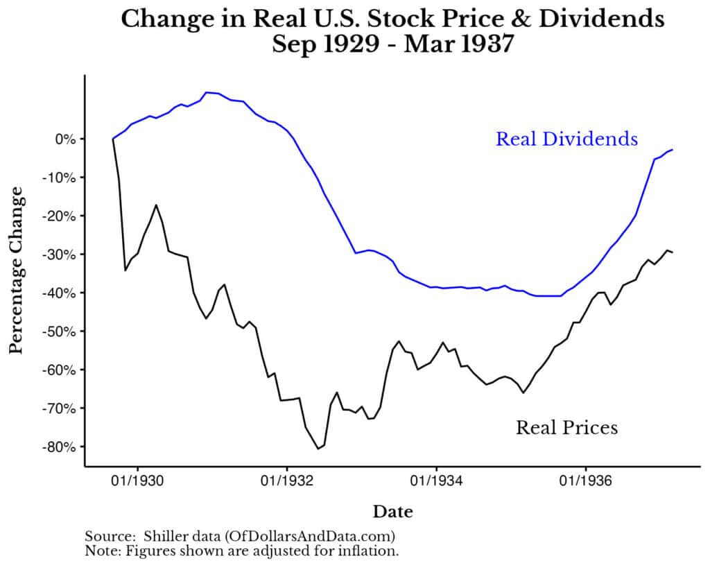 Denna bild var intressant. Innebär att man får mer köpkraft för sina utdelningsbelopp vid en nedgång då aktiepriserna sjunker mer än utdelningarna i %. Blir därmed lättare psykologiskt att behålla vid en större nedgång samt ekonomiskt bättre så länge man kör just keep buying. Vilket jag tycker är en bra del i strategin med utdelningsaktier.