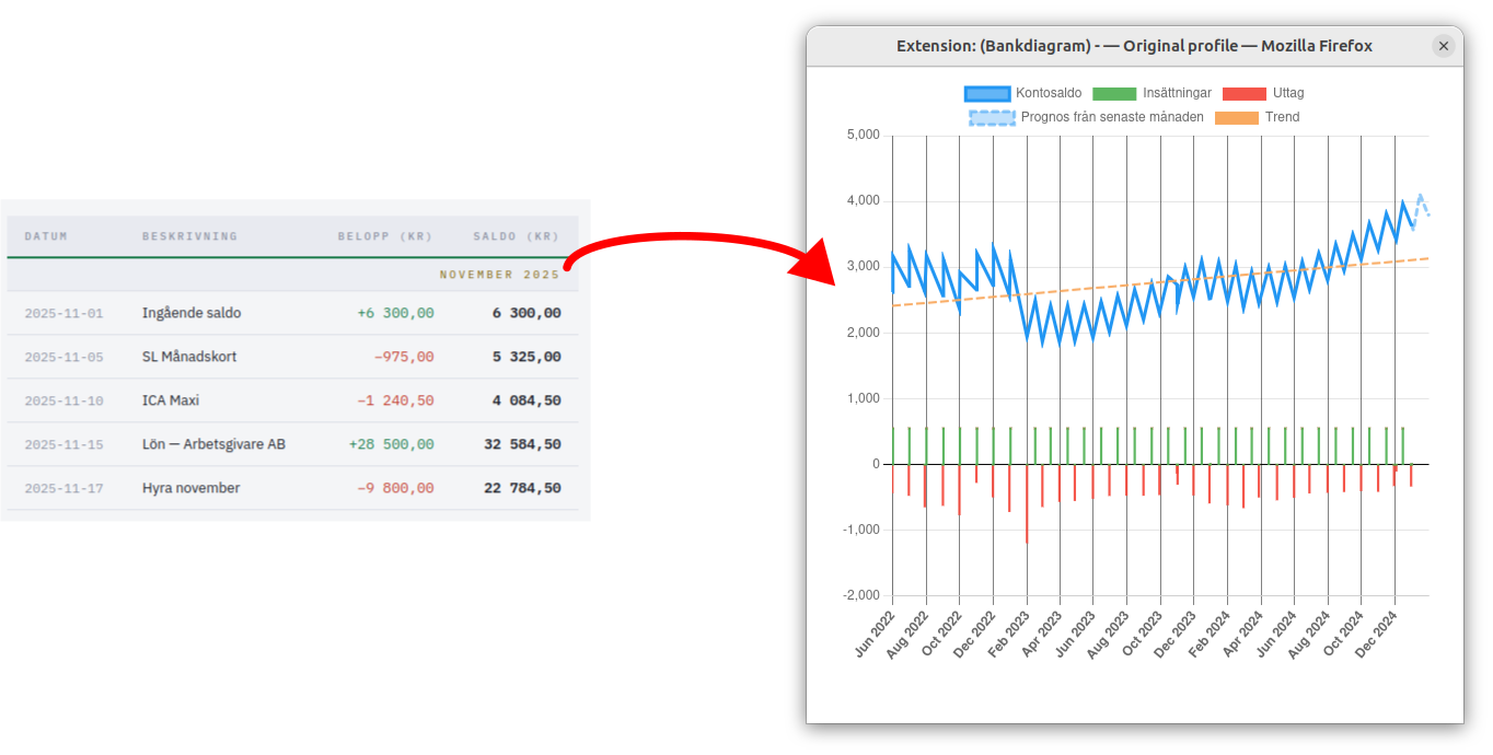 Inspirerad av en annan tråd så började jag fila på ett gratis enkelt plugin till webbläsaren som gör ett diagram över en transaktionerna på ett bankkonto.