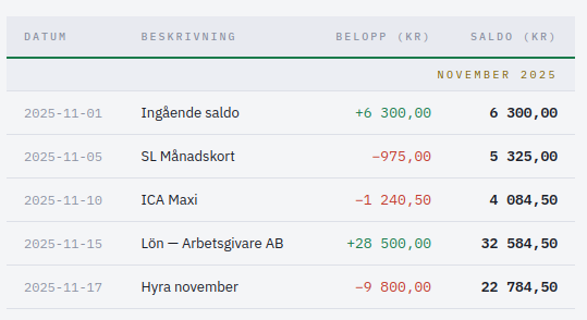 Just nu är x-axeln en datumlinje, istället för att ha ett “steg” per transaktion. Fördelen är att man får en känsla av hur ändringen ser ut över tid. Nackdelen är att transaktioner som är på samma datum summeras och linjen som visar saldo visar inte lägsta och högsta saldo som varit under en dag, utan bara dagens slutresultat. Det gör att man kan tro att man har haft marginal till botten om det kom in mycket pengar samma dag som det gick ut mycket pengar.