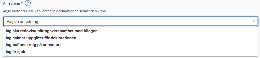 Lämnar du din deklaration efter den 2 maj (ordinarie deklarationstidpunkt) utan att ha fått anstånd, riskerar du att få betala en förseningsavgift. Om du har fått anstånd och lämnar deklarationen efter beviljat anståndsdatum, riskerar du också att få betala en förseningsavgift.