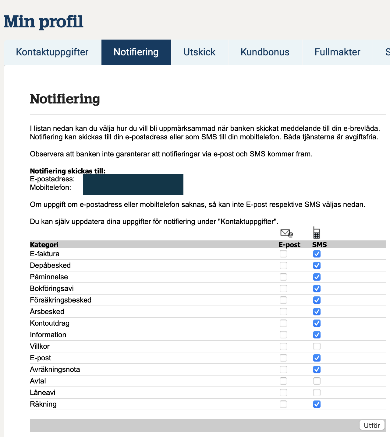 Vilka banker ger notifiering i sin mobilapp och/eller skickar e-post när man får en e-faktura?