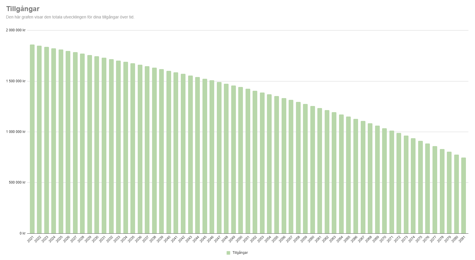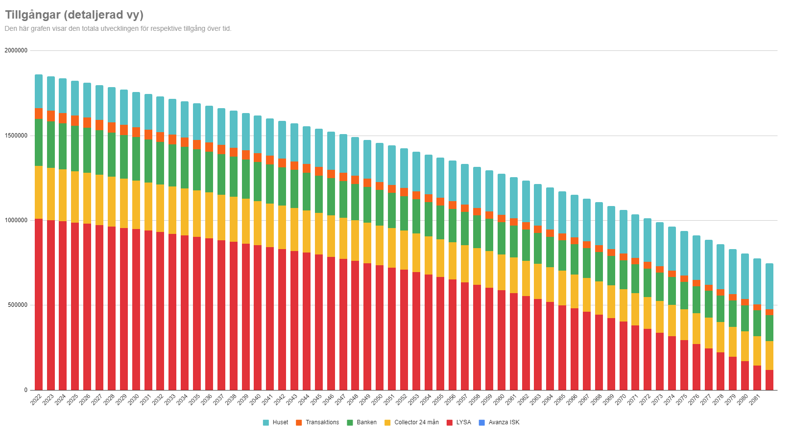 Vi planerade in uttag av tillgångarna på ca 3 500 SEK per månad från och med i år fram till 100 års dagen. På det här sättet kommer tillgångarna vara över 1 Mkr fram till 2071 och kommer aldrig gå under 500 000 SEK. Väldigt defensiv tillgångsfördelning med bara ca 40 % aktier.