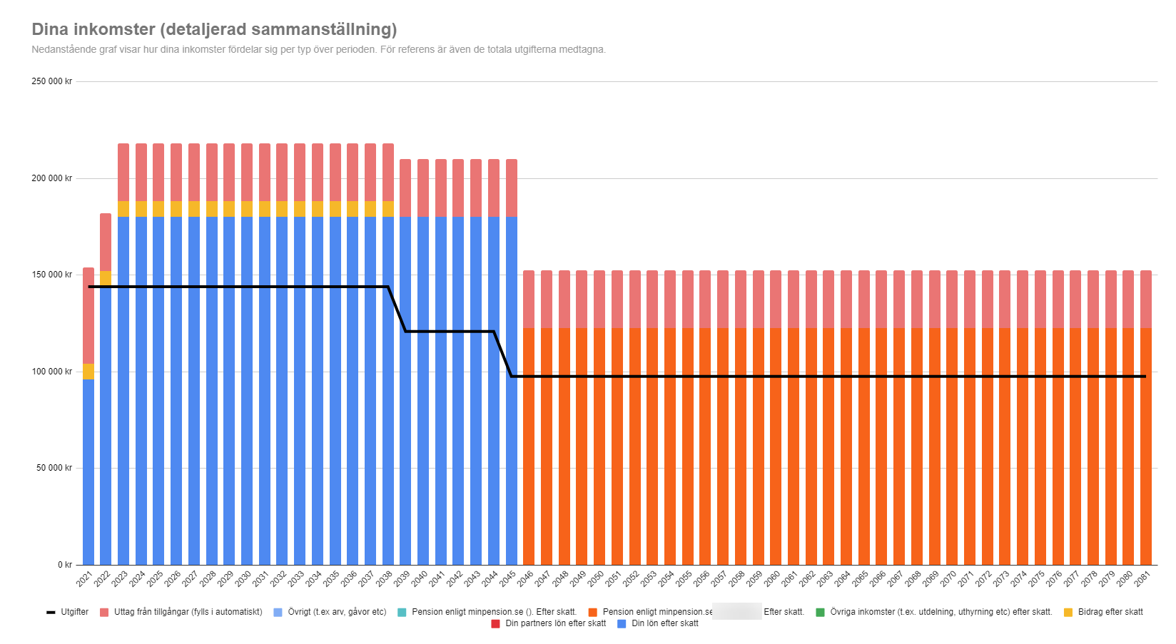 Vi konstaterade att det absolut viktigaste i kalkylen var att hålla koll på utgifterna. Utgifterna är ju viktigast eftersom de styr hur mycket pengar som behöver komma in. Det är ju därför jag brukar rekommendera att utgå från dessa när man räknar fram behovet av sitt ekonomiska målkapital.
