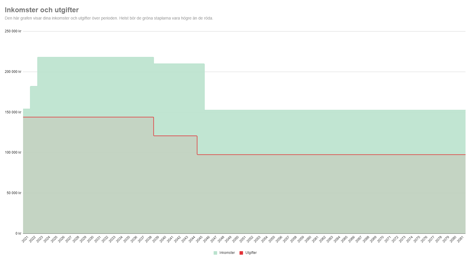 Det här ger personen möjlighet att var Barista FIRE och välja hur mycket man vill jobba. Egentligen bygger det på att årsinkomsten mellan idag och 2046 ligger på ca 180 000 SEK netto per år (ca 15 000 SEK netto eller 21 000 SEK i månaden). Hade egentligen räckt med ca 10 000 SEK i månaden om man accepterade lite lägre marginaler.