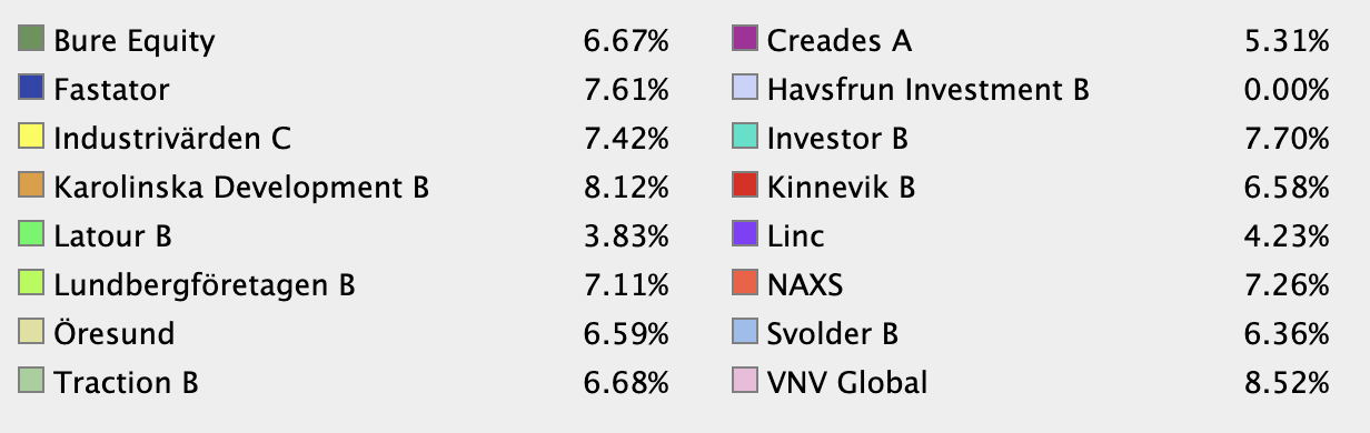 Om du vill behålla investmentbolagen så skulle jag rekommendera att följa IBIndex filosofi och viktning. De köper inga investmentbolag som har högre premie än 15 % men säljer samtidigt inte för att premien drar iväg.
