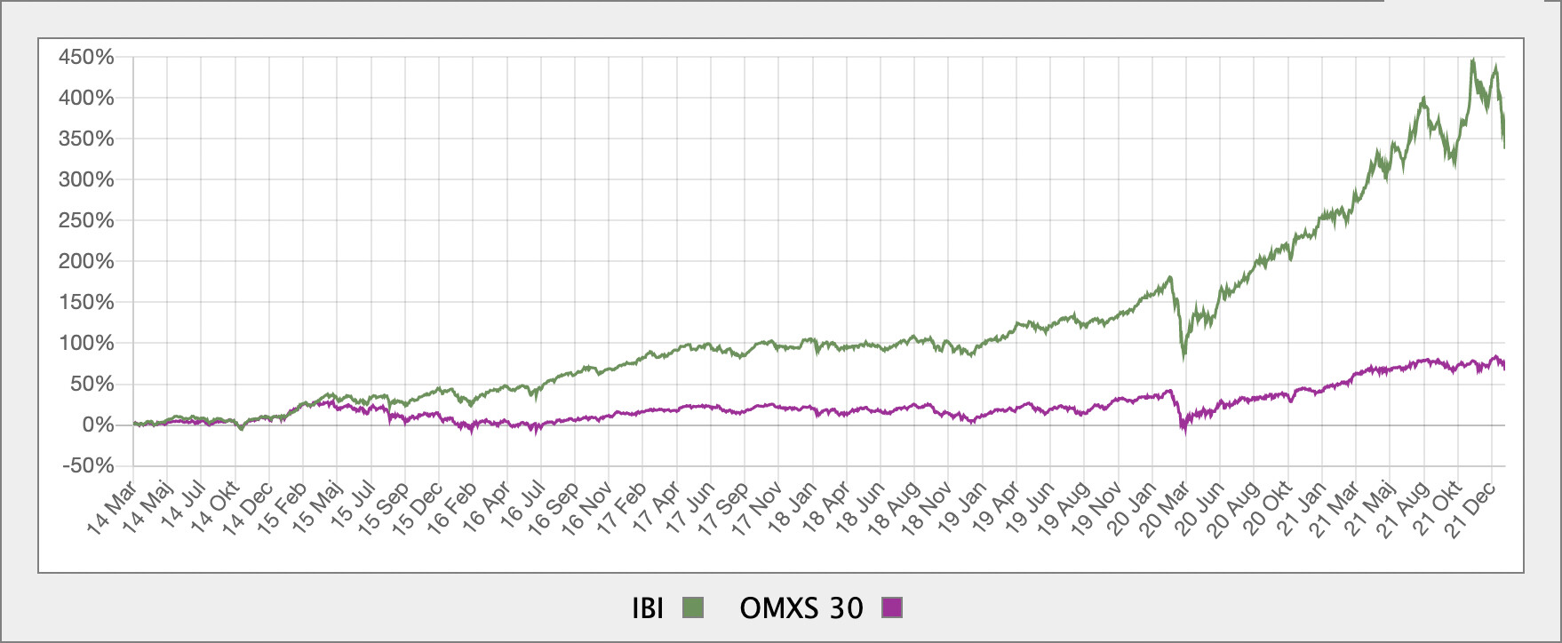 IBIndex utveckling i förhållande till OMXS30 senaste åren.
