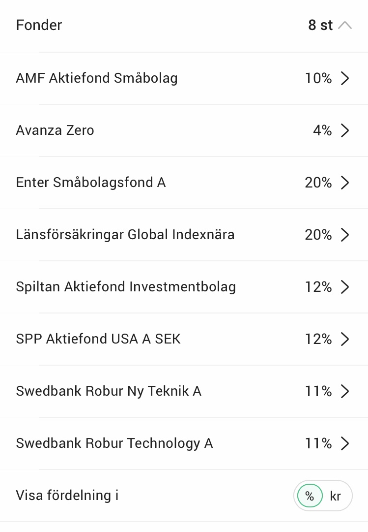 Vi har tidigare månadssparat i LF Global Indexnära och Avanza Zero till barnen. Breda, billiga fonder och jag ser ingen anledning till att sprida ut det på fler fonder än en handfull.