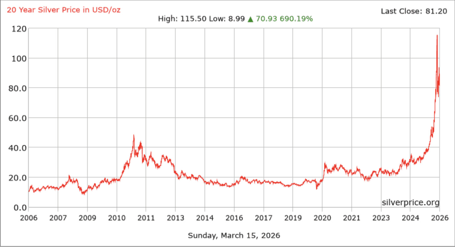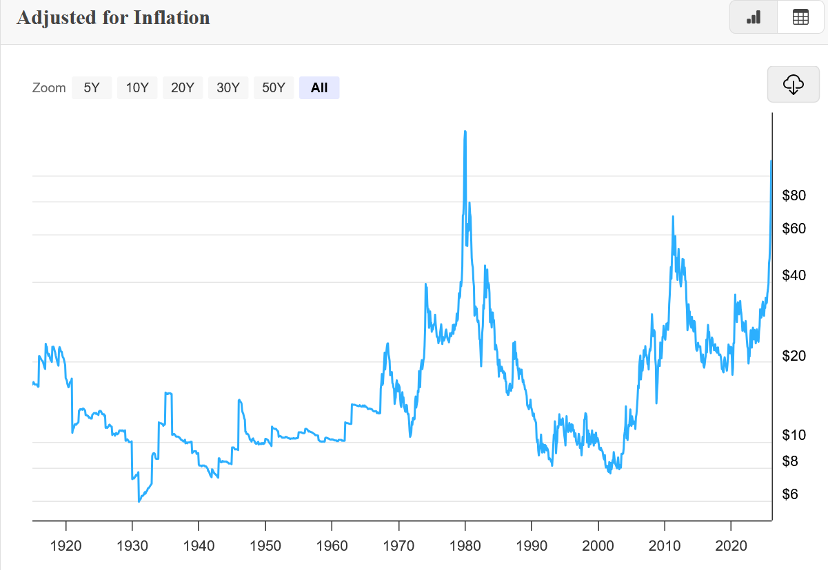 Håller med. Har man inte investerat i silver tidigare kanske man ser det som en hedge mot någonting annat. Men man får ha med att silver just nu är dyrt ur ett historiskt perspektiv. Det behöver så klart inte betyda att det inte fortsätter upp men risken är betydligt högre nu än för bara ett år sedan.
