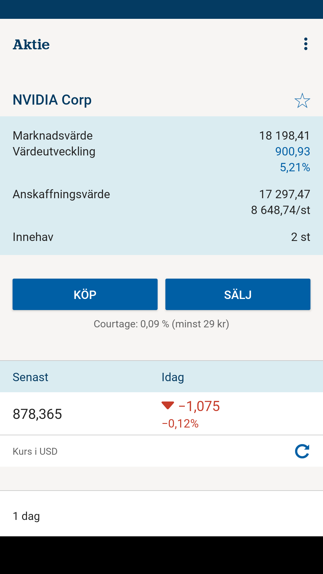 Tack alla för supersnabba svar! Efter att ha börjat följa Rikatillsammans har jag insett att global indexfond verkligen är bäst, men jag kom igång före jag läst på så noga, och investerade direkt i individuella företag/aktier. Har nu ca 50.000:- investerat i aktier (Nvidia, Amazon, Novo Nordisk, Eli Lilly och Rheinmetall). Kommer gå vidare med en global indexfond men även fortsätta lite med aktier, och då verkar det faktiskt som att Nordea har lägre courtage (0,09%) än Avanza (0,21%). I min sambos Nordea-app kunde han se information om när han köpt sina aktier och en himla massa mer, medan det är mycket knapphändigt med info på Handelsbankens app (har tagit screenshot, finns visserligen lite mer info längre ner men kunde bara infoga 1 screenshot). Så frågan är väl snarast hur bra Avanzas app är när det gäller aktier, då jag gärna vill få en bra överblick, eller om Nordea är bättre pga lågt courtage?