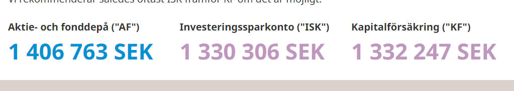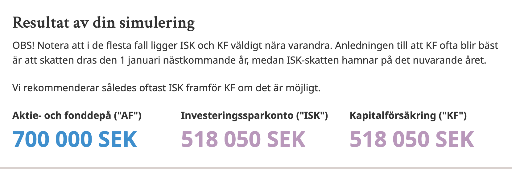 Hej, jag bara undrar om jag räknar rätt, jag får att AF-konto har varit mer lönsamt än ISK konto, alla säger typ tvärtom. Satte o kr i månadssparande och 10år sparande och 7% avkastning. Använder denna kalkylator Är det värt byta till ISK? | Jämför själv med vår kalkylator och köpte bankaktier för 100 000kr tror det var 2008 och de är värda ca 700 000kr idag, det är utan utdelningarna som jag placerat i annat. I kalkylatorn “Hur mycket av startbeloppet är en orealiserad vinst?” satte jag 600 000kr, det blir väl rätt 700 000-100 000kr?. Under avancerade inställningar satte jag årlig skatt till 0 då det är aktier. På genomsnittlig statslåneränta stod där redan 1,94% Jag får detta resultatet