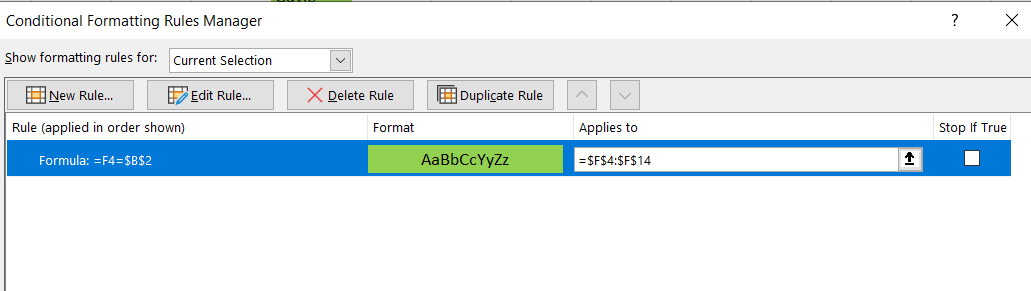 Det är viktigt att komma ihåg att referensen F4 i det här fallet inte får vara låst med $ (blir ofta standard). Om den referensen är låst så kommer alla celler i det valda området formatteras utifrån F4 istället för det egna värdet.