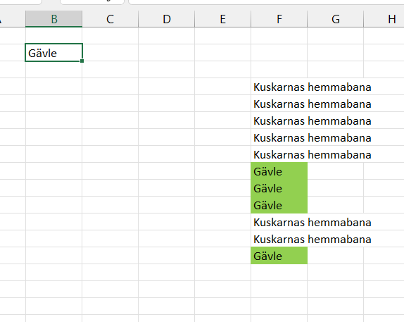 hej skulle vilja ha hjälp med följande i cell b2 står der gävle i kolumn f4 och nedåt står det kuskarnas hemmabana skulle vilja i detta fall i b2 står det gävle