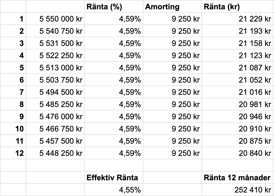 Om du har initialt lånebelopp W, månatlig amorteraring a, och nominell årsränta r, så kommer total räntekostnad bli \sum_{k = 0}^{11}((W-ka)(r/12)) vilket förenklas till Wr - ar\frac{11}{2}